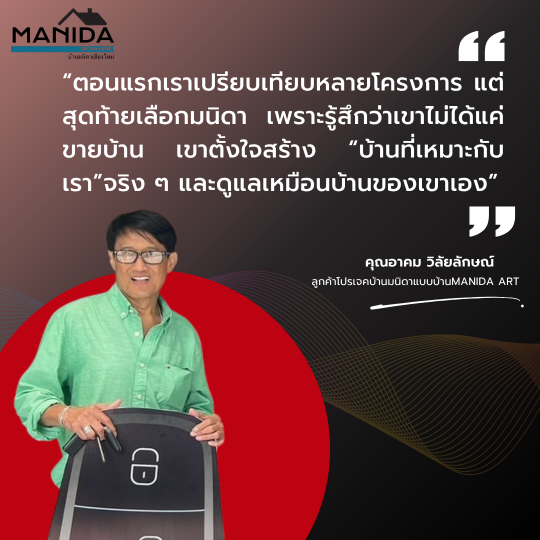 “ตอนแรกเราเปรียบเทียบหลายโครงการ แต่สุดท้ายเลือกมนิดา เพราะรู้สึกว่าเขาไม่ได้แค่ขายบ้าน เขาตั้งใจสร้าง “บ้านที่เหมาะกับเรา”จริง ๆ และดูแลเหมือนบ้านของเขาเอง”